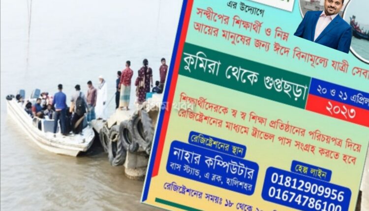 ঈদযাত্রা সহজ এবং সুগম করতে চট্টগ্রাম-সন্দ্বীপ উপকূলীয় নৌ-রুটের শিক্ষার্থীদের ফ্রি সেবা দেয়ার উদ্যোগ নেয়া হয়েছে।বিশিষ্ট ব্যবসায়ী আফতাব খান অমি এবং যুক্তরাষ্ট্র প্রবাসী মিজানুর রহমান ভূঁইয়া মিল্টনের সহায়তায় ‘হিউম্যান ২৪’ নামে একটি সেচ্ছাসেবী সংগঠনের উদ্যোগে এই সেবা দেওয়া হচ্ছে।