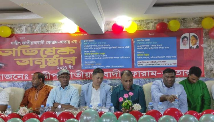 সন্দ্বীপ জাতীয়তাবাদী ফোরাম কাতারের অভিষেক ২০২২ অনুষ্ঠিত হয়েছে,রাজধানী দোহার নিউ জামান রেস্টুরেন্টে সংগঠনের সহ-সভাপতি মইনুল শুভর সঞ্চালনায় সভাপতিত্ব করেন সন্দ্বীপ জাতীয়তাবাদী ফোরাম কাতারের সম্মানিত সভাপতি শাহাদাত হোসেন হৃদয়।