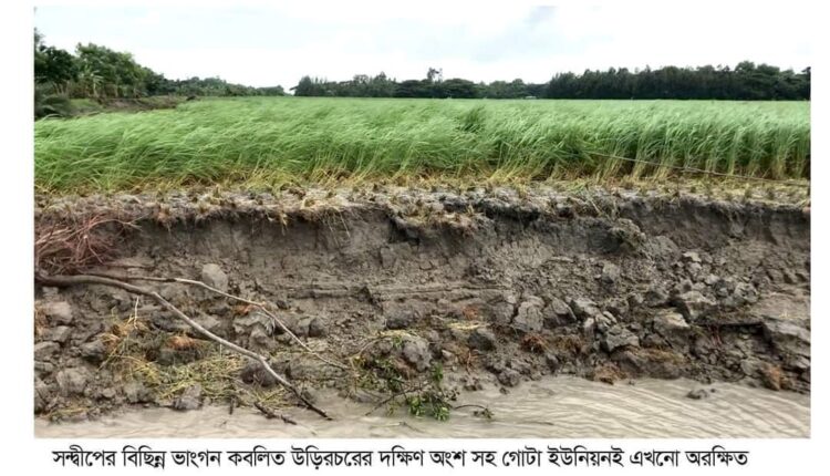 এ ছাড়া সন্দ্বীপ মূল ভূ-খন্ড থেকে নদী-সাগর বেষ্টিত বিচ্ছিন্ন উড়িরচর ইউনিয়নের চর্তুপাশে বেড়ীবাঁধ নেই যুগ যুগ ধরে। বিশেষ করে চরের দক্ষিণ অংশ নদী ভাঙ্গন কবলিত এলাকা। এ চরের প্রায় ৪০ হাজার মানুষের জন্য মাত্র ২টি সাইক্লোন শেল্টার ও ২/১টি সাইক্লোন শেল্টার কাম স্কুল ভবন আছে বলে জানিয়েছেন স্থানীয়রা। উল্লেখ্য, ৮৫’র প্রলয়ংকারী ঘূর্ণিঝড়ে বেড়ীবাঁধহীন উড়িরচরে প্রায় ১০ হাজারের উপরে মানুষ মারা গিয়েছিলো যা আন্তর্জাতিক গণমাধ্যমে ফলাও করে প্রচার হয় এবং তৎকালীন বাংলাদেশের রাষ্ট্রপ্রাধান সহ ভারত-পাকিস্তান-শ্রীলংকা ও মালদ্বীপের রাষ্ট্রপ্রধানরা সরেজমিনে উড়িরচরে এসেছিলেন।