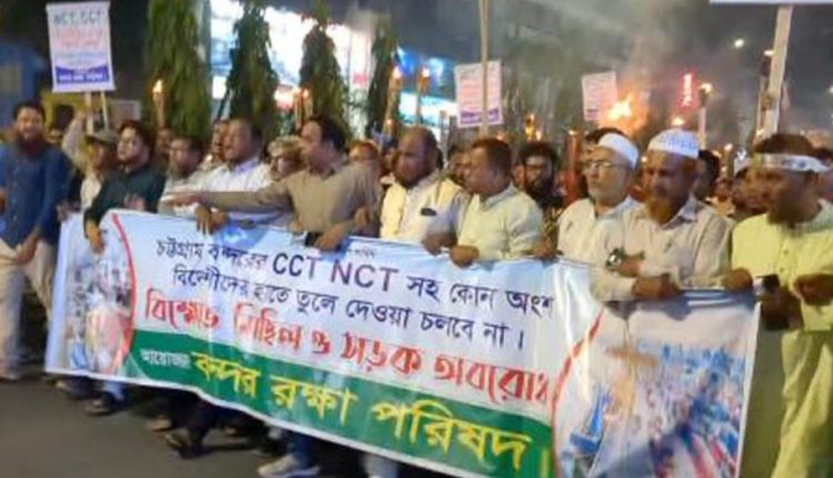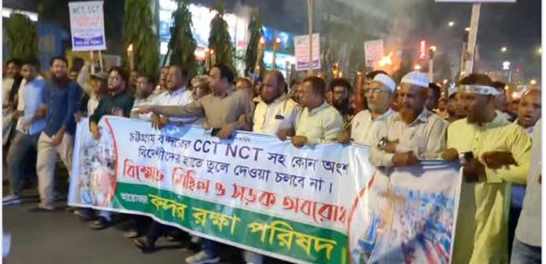 চট্টগ্রামের নিউমুরিং কনটেইনার টার্মিনাল(এনসিটি) ও চিটাগাং কনটেইনার টার্মিনালসহ(সিসিটি)বন্দরের কোনো অংশ বিদেশিদের হাতে না দেওয়ার দাবিতে মশাল মিছিল,সড়ক অবরোধ করেছে বন্দর রক্ষা পরিষদ।