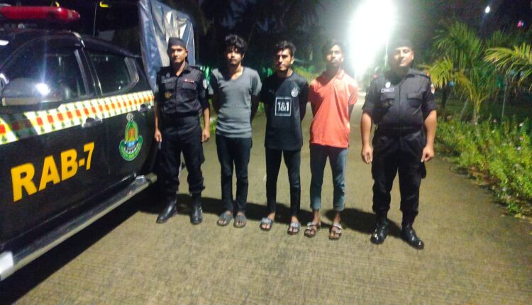 কতিপয় দৃষ্কৃতিকারী কিশোর গ্যাংয়ের সদস্যরা দেশীয় অস্ত্রশস্ত্রে সজ্জিত হয়ে চট্টগ্রাম মহানগরীর ইপিজেড থানাধীন এম আলী নগরস্ত একটি গ্যারেজ সংলগ্ন রাস্তার পাশে নিভৃত স্থানে সমবেত হওয়ার খবর পেয়ে র্যাব-৭,চট্টগ্রাম বিশেষ অভিযান পরিচালনা করে চট্টগ্রামের সল্টগোলা ক্রসিং এলাকার ফারুক মাঝির ছেলে নুর মোহাম্মদ নয়ন,ইপিজেড এলাকার মৃত হানিফের ছেলে সম্রাট,নোয়াখালী বসুরহাটের আবদুল হাদির ছেলে রাহাদকে আটক করতে সক্ষম হয়।আকটকৃত আসামীদের দেহ তল্লাশী করে ধারালো ২টি স্টীলের চাকু এবং ১টি ধারালো খুর উদ্ধার করেন র্যাব।