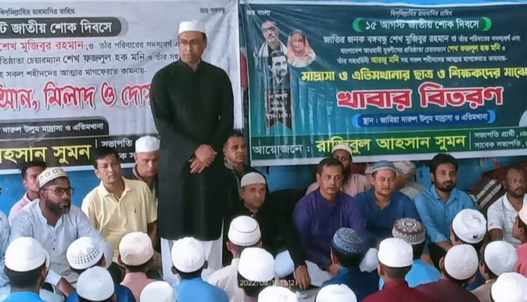 জাতীয় শোক দিবস উপলক্ষে শহীদের আত্মার মাগফিরাত কামনায় খতমে কোরআন,মিলাদ দোয়া মাহফিল এবং মাদ্রাসার ছাত্র-শিক্ষকদের মাঝে খাবার বিতরন করেন রাজিবুল আহসান সুমন।