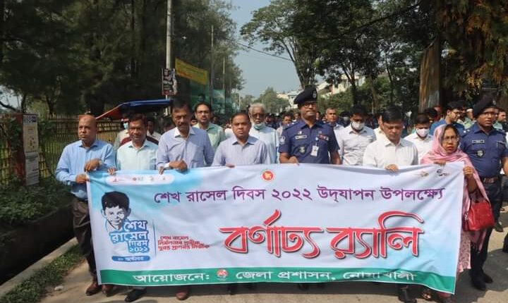 মঙ্গলবার (১৮ অক্টোবর) সকালে শেখ রাসেল দিবস ২০২২ উপলক্ষে নোয়াখালী জেলা প্রশাসন কর্তৃক আয়োজিত হয় দিনব্যাপী অনুষ্ঠানমালার। বর্ণাঢ্য র্যালি, আলোচনা সভা,বিভিন্ন প্রতিযোগিতার পুরস্কার বিতরণী এবং ফ্রিল্যান্সারদের মধ্যে ল্যাপটপ বিতরণ কার্যক্রমের মাধ্যমে জাতির পিতা শেখ মুজিবুর রহমানের কনিষ্ঠ পুত্র শেখ রাসেলের জন্মদিন পালন করা হয়।