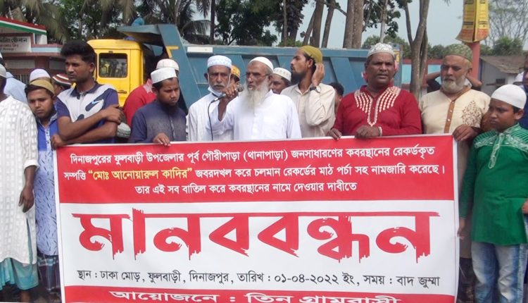 এর প্রতিবাদে গতকাল জুম্মার নামাজের পর তিন গ্রামের কয়েকশত মানুষ ফুলবাড়ী-ঢাকা মহাসড়ক অবরোধ করে ঘন্টা ব্যাপি মানববন্ধন করেছেন।মানববন্ধনে বক্তারা শত বছরের বাপ,দাদার কবরস্থান থেকে জবরদখলদার আনোয়ারুল কাদিরের নাম চলমান রেকর্ডের মাঠ পর্চা ও নামজারি থেকে নাম বাদ দিয়ে জনসাধরণের কবরস্থান নামে মাঠ পর্চা ও নামজারির দাবি করেন।