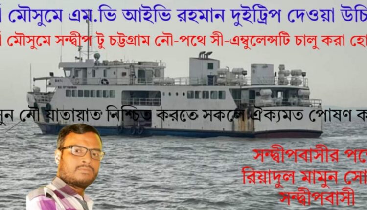 গতকাল সন্দ্বীপের একজন মা ব্রেইনস্ট্রক করে সন্দ্বীপের কূলে ৪৮ ঘন্টা অপেক্ষা করেও বৈরী আবহাওয়ার কারণে চট্টগ্রামে পৌঁছাতে পারেননি।আবহাওয়া খারাপ থাকলে ঘাট কর্তৃপক্ষ কেন দায়ী হবে যেখানে সরকার আমাদের সন্দ্বীপবাসীর জন্য সী-এম্বুলেন্স দিয়ে রেখেছেন।তাই এই বর্ষার মৌসুমে এম.ভি আইভি রহমান দুইবার আসা-যাওয়া করা এবং সী-এম্বুলেন্স চালু রাখা সন্দ্বীপবাসীর প্রাণের দাবী হয়ে দাঁড়িয়েছে।