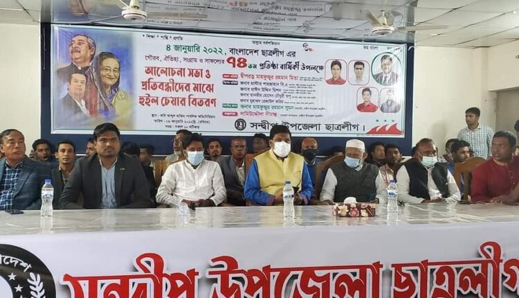 গৌরব ঐতিহ্য সংগ্রাম ও সাফল্যের বাংলাদেশ ছাত্রলীগ এর ৭৪ তম প্রতিষ্ঠা বার্ষিকী উপলক্ষে সন্দ্বীপ উপজেলা ছাত্রলীগ কতৃক আয়োজিত ০৯ জানুয়ারী,২০২২ইং রোজ রবিবার সন্দ্বীপ উপজেলা কবি আব্দুল হাকিম পাবলিক অডিটোরিয়াম আলোচনা সভা ও অসহায় শারীরিক প্রতিবন্ধীদের মাঝে হুইল চেয়ার বিতরন করা হয়েছে।সন্দ্বীপ উপজেলা ছাত্রলীগ সভাপতি মাহফুজুর রহমান সুমন এর সভাপতিত্বে,সাধারণ সম্পাদক সামিউদ্দৌলা সীমান্ত এর সঞ্চালনায় উক্ত অনুষ্ঠানে প্রধান অতিথি হিসাবে উপস্থিত ছিলেন সন্দ্বীপ এর সাংসদ মাহফুজুর রহমান মিতা।
