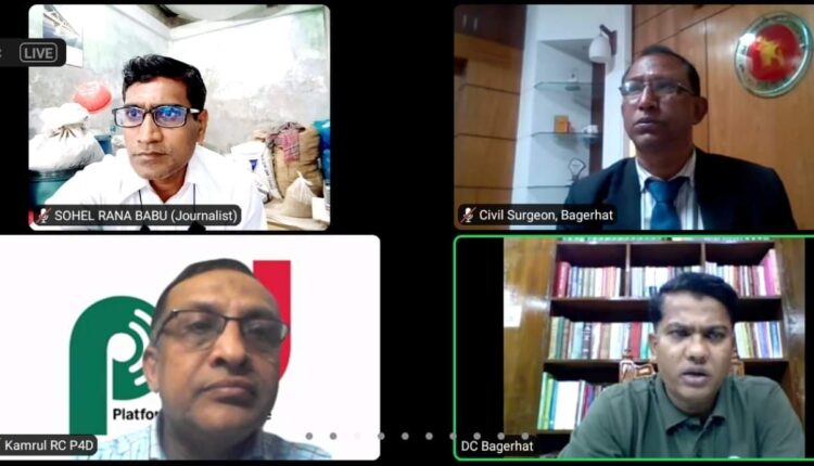 বাগেরহাটে কমিউনিটি ক্লিনিকের সেবা বৃদ্ধি বিষয়ক পর্যালোচনা সভা অনুষ্ঠিত হয়েছে।২৬/০২/২০২২ শনিবার বিকেলে বাগেরহাট ডিস্ট্রিক্ট পলিসি ফোরামের আয়োজনে ও প্লাটফরম ফর ডায়াগ প্রকল্পের সহযোগিতায় এই সভা অনুষ্ঠিত হয়। ভার্চুয়ালি অনুষ্ঠিত এই সভায় প্রধান অতিথি ছিলেন, বাগেরহাটের জেলা প্রশাসক মোহাম্মদ আজিজুর রহমান।