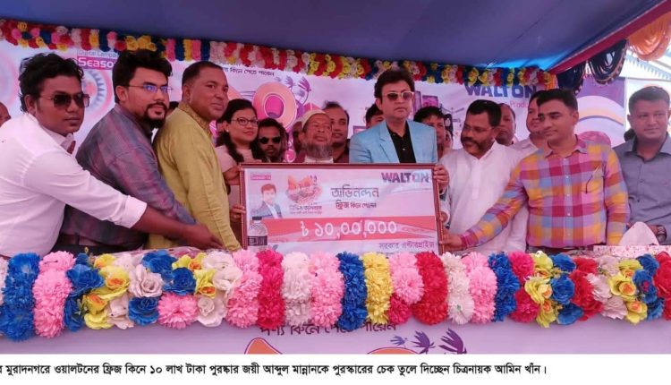 কুমিল্লার মুরাদনগরে দেশীয় পন্য ওয়ালটনের ফ্রিজ ক্রয় করে ১০ লাখ টাকা পুরস্কার পেয়েছেন আব্দুল মান্নান নামে এক মসজিদের ইমাম। আব্দুল মান্নান উপজেলার খামারগ্রাম গ্রামের মৃত. তালেব আলীর ছেলে ও খামারগ্রাম জামে মসজিদের ইমাম। শনিবার বিকেলে আব্দুল মান্নানের হাতে ওয়ালটনের পক্ষ থেকে ১০ লাখ টাকার পুরস্কারের চেক তুলে দেন বাংলাদেশ চলচ্চিত্র নায়ক ও ওয়ালটনের ব্র্যান্ড অ্যাম্বাসেডর আমিন খাঁন।