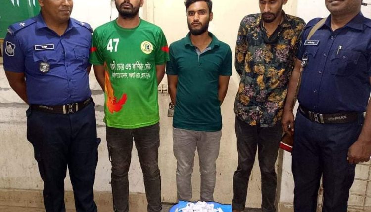 পুলিশ জানায়,রাত সাড়ে সাতটার দিকে গোপন সংবাদের ভিত্তিতে এস আই আবু হেনা মোস্তফার নেতৃত্বে একদল পুলিশ উপজেলা সদর এলাকায় অভিযান পরিচালনা করে।এসময় কাজী নোমান আহাম্মদ ডিগ্রি কলেজের সামনে হতে ওই তিনজনকে সন্দেহ হলে পুলিশ তাদের তল্লাশী করে।