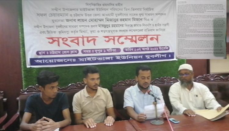 সন্দ্বীপের মাইটভাঙ্গা ইউনিয়ন পরিষদের চেয়ারম্যান মিজানুর রহমানের বিরুদ্ধে জমি দখলের মিথ্যা অপপ্রচার করা হচ্ছে দাবি করে সংবাদ সম্মেলন করেন মাইটভাঙ্গা ইউনিয়ন যুবলীগ।