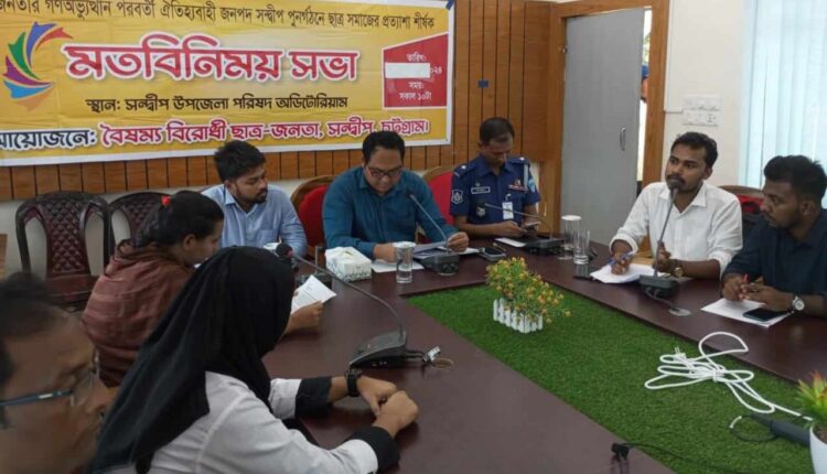 সন্দ্বীপে ছাত্র জনতার গন অভ্যুত্থানের পরবর্তী ঐতিয্যবাহী জনপদ সন্দ্বীপ পুনর্গঠনে ছাত্র জনতার প্রত্যাশা শীর্ষক মতবিনিময় সভা অনুষ্ঠিত হয়েছে।মঙ্গলবার সকালে সন্দ্বীপ উপজেলা পরিষদের কনফারেন্স রুমে এ মতবিনিময় সভা অনুষ্ঠিত হয়। অনুষ্ঠানের শুরুতে জুলাই আগষ্ট ছাত্র আন্দোলনের নিহত শহীদের স্বরণে দাড়িয়ে ১ মিনিট নিরবতা পালন করা হয়।