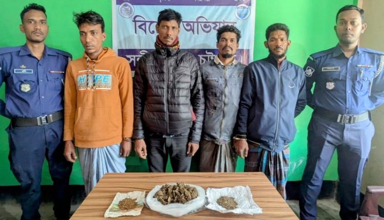 চট্টগ্রামের সন্দ্বীপ উপজেলায় যৌথ বাহিনী ও পুলিশের অভিযানে গাঁজাসহ ৪ মাদক ব্যবসায়ীকে গ্রেফতার করেছে।মঙ্গলবার গ্রেফতারকৃতদের আদালতে হাজির করলে বিচারকের নির্দেশে তাদের কারাগারে পাঠানো হয়েছে।তারা হলেন ফারুক(৩৯),আবদুল হান্নান প্রকাশ শরিফ(৩৩),মনির(৩৮) ও পারভেজ(৩৫)।গ্রেফতারকৃতদের মধ্যে ৩ জন আমানউল্লাহ ইউনিয়নের ৯ নং ওয়ার্ডের বাসিন্দা ও শরিফ গাছুয়া ২ নং ওয়ার্ডের বাসিন্দা।