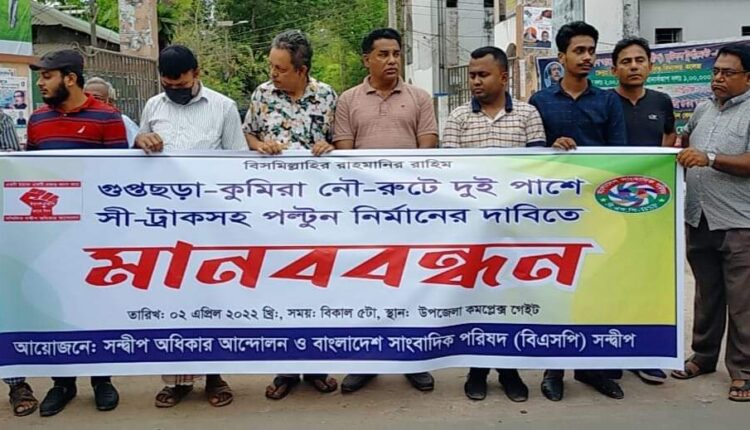 সন্দ্বীপ কুমিরা গুপ্তছড়া নৌ-রুটে নিরাপদ যাত্রী সেবা নিশ্চিত করতে বাংলাদেশ সাংবাদিক পরিষদ সন্দ্বীপ উপজেলা শাখার মানববন্ধন।