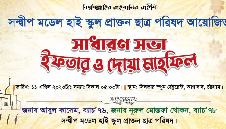 সন্দ্বীপ মডেল হাই স্কুল প্রাক্তন ছাত্র-ছাত্রী পরিষদের সাধারণ সভা, ইফতার ও দোয়া মাহফিল গত ১১ এপ্রিল ২০২৩,মঙ্গলবার অনুষ্ঠিত হয়।বিদ্যালয়ের প্রাক্তন ছাত্র একেএইচ গ্রুপের ডিএমডি মোঃ আবুল কাসেম ও কাতার প্রবাসী বিশিষ্ট ব্যবসায়ী নুরুল মোস্তফা খোকনের সৌজন্যে ও উপস্থিতিতে চট্টগ্রাম শহরের আগ্রাবাদস্থ সিলভার স্পুন রেস্টুরেন্টে এ ইফতার মাহফিল অনুষ্ঠিত হয়।