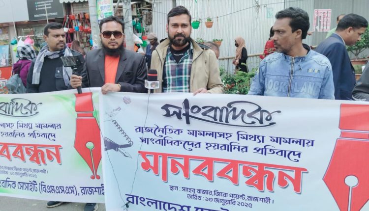 সোমবার(১৩ জানুয়ারি) রাজশাহী নগরীর জিরো পয়েন্ট এলাকায় বাংলাদেশ সেন্ট্রাল প্রেসক্লাব,জাতীয় সাংবাদিক সংস্থা রাজশাহী বিভাগ ও রাজশাহী মডেল প্রেসক্লাবের আয়োজনে রাজশাহীর স্থানীয় সাংবাদিক সংগঠনসহ রাজশাহীর বিভিন্ন জেলা ও উপ-জেলার সাংবাদিক সংগঠনের ব্যানারে এই মানববন্ধন করা হয়। মানববন্ধনে সাংবাদিকেরা বলেন, আমাদের সারা দেশের সহকর্মীদের নাই এইভাবে ঢালাও মিথ্যা মামলা প্রত্যাহার করা হোক। সাংবাদিকদের ভূমিকা না থাকলে চব্বিশের পরিবর্তন সম্ভব ছিলো না। পরিবর্তনের পর দেশের কিছু সুবিধাবাদী কুচক্রী মহল বিতর্কিত কর্মকাণ্ড ঘটানোর সুযোগ নেয়। চব্বিশের পরিবর্তনের পর বৈষম্য বিরোধী ছাত্র আন্দোলন ও বিভিন্ন রাজনৈতিক নেতারা বলেছিলেন দেশের কোথাও নির্দোষ ও সাধারণ মানুষের নামে হয়রানি মূলক মামলা করা হবে না। কিন্তু আজ সেটাই হচ্ছে।