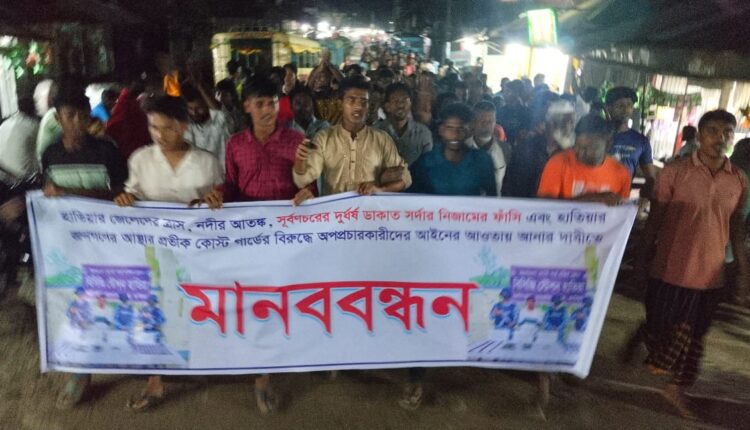হাতিয়ায় জেলেদের আতঙ্ক নদীতে ত্রাস সৃষ্টিকারী দুর্ধর্ষ ডাকাত সর্দার অস্ত্র সহ আটক নিজাম উদ্দিনের ফাঁসির দাবিতে মানববন্ধন ও বিক্ষোভ মিছিল করেছে স্থানীয় জেলেরা।